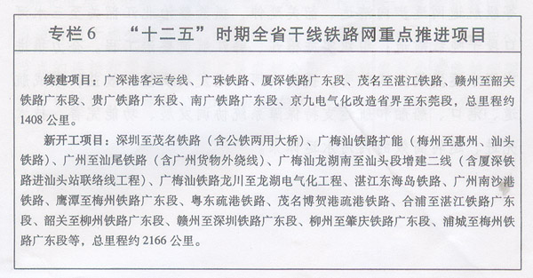 三、主要任務(wù) ?。ㄒ唬┘涌旖煌ㄟ\(yùn)輸線網(wǎng)建設(shè)。 完善縱貫?zāi)媳?、橫跨東西的全省綜合運(yùn)輸通道,適度加密珠江三角洲地區(qū)運(yùn)輸線網(wǎng),促進(jìn)東西北地區(qū)綜合運(yùn)輸線路成網(wǎng)。加大力度建設(shè)鐵路網(wǎng)、城際軌道交通網(wǎng)和高等級(jí)航道網(wǎng),完善高速公路網(wǎng),基本建成輸油氣管網(wǎng)。 1.大力發(fā)展軌道交通。 干線鐵路。積極推進(jìn)干線鐵路建設(shè),基本建成東聯(lián)海峽西岸、聯(lián)通長(zhǎng)江三角洲地區(qū),西通桂黔、輻射大西南地區(qū),北達(dá)湘贛、連接中原地區(qū)的高(快)速鐵路網(wǎng)絡(luò)骨架;推進(jìn)廣深港、廈深、深茂等鐵路建設(shè),實(shí)現(xiàn)主要通道客貨分線;擴(kuò)建改造既有繁忙干線,提高通道的運(yùn)輸效率和運(yùn)輸能力。建設(shè)一批沿海主要港口集疏運(yùn)鐵路,提升港口輻射能力和整體競(jìng)爭(zhēng)力。到2015年,全省干線鐵路營(yíng)運(yùn)里程約達(dá)3697公里。 ?