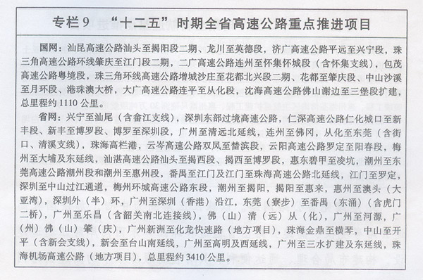 3.繼續(xù)完善公路網(wǎng)絡(luò)。以珠江三角洲為中心,加快國(guó)家高速公路粵境段、高速公路出省通道和珠江口東西兩岸跨江通道建設(shè),構(gòu)建布局合理、通達(dá)便利和具有較高服務(wù)水平的高速公路網(wǎng)絡(luò)。 加強(qiáng)以國(guó)省道為重點(diǎn)的普通公路建設(shè),提升國(guó)省道普通干線公路技術(shù)等級(jí)、通行能力和服務(wù)水平,打造國(guó)道和主要省道“養(yǎng)護(hù)管理示范路”,形成規(guī)模穩(wěn)定、結(jié)構(gòu)合理、連接完善的國(guó)省道普通干線公路網(wǎng)絡(luò),增強(qiáng)普通國(guó)道對(duì)全省縣級(jí)以上行政中心節(jié)點(diǎn)的連接和覆蓋。鞏固發(fā)展農(nóng)村公路,加強(qiáng)農(nóng)村公路養(yǎng)護(hù)管理和升級(jí)改造,每年建設(shè)5000公里左右的社會(huì)主義新農(nóng)村公路。