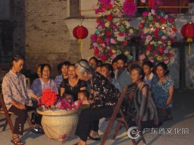 “月姐歌”以當(dāng)?shù)鬲?dú)有的方言演唱,無伴奏清唱,有獨(dú)唱、合唱、對(duì)唱、表演唱等形式。歌詞涉及大量的農(nóng)業(yè)生產(chǎn)、生活、氣節(jié)的內(nèi)容,或敘事抒情,或敘述時(shí)令節(jié)氣,或描寫人間的冷暖世態(tài),或歌唱愛情。“月姐歌”活動(dòng)由準(zhǔn)備活動(dòng)、接月姐、迷月姐、送月姐四部分組成。其中迷月姐為活動(dòng)重要環(huán)節(jié),包括:“繡香包”調(diào)、“石榴打花”調(diào)、“睇龍船”調(diào)三大部分?!袄C香包”調(diào)屬于宮調(diào)式,內(nèi)容主要表達(dá)男女之間的純真愛情;“石榴打花”調(diào)屬于徵調(diào)式,最具代表性,內(nèi)容多為表達(dá)人們對(duì)美好生活的向往;“睇龍船”調(diào)屬于羽調(diào)式,主要描寫人們賽龍舟時(shí)的熱鬧情景。