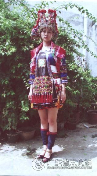 女裝包括長衣、內(nèi)裙(百褶裙)、護衣、圍裙等;服飾由頭飾、圍裙、腰帶、腳綁、大方巾等刺繡飾品。佩有三角耳環(huán)、手鐲、金銀釵、銅錢、銅扣、銀扣、珠子等;刺繡品用紅、黃、綠、青、白五種顏色,多以紅黃綠為主色調(diào)。除日常服飾外,女裝還區(qū)分為未婚少女裝、已婚婦女裝、嫁裝和師娘、歌嬤服等。女裝注重頭部裝飾和腰部以下的裝飾,頭飾有未婚和已婚之別,而腰飾的穿戴條理則可體現(xiàn)生活狀況,腳綁是瑤族婦女適應(yīng)大山生活,用以防蚊蟲、蛇、草、刺等。此外,乳源瑤族服飾中的童裝主要表現(xiàn)在兒童帽和上衣的標志,且多以鈴鐺、銅錢等信物代表吉祥、辟邪等寓意,以祈求神靈保佑,禱告新生命健康成長。