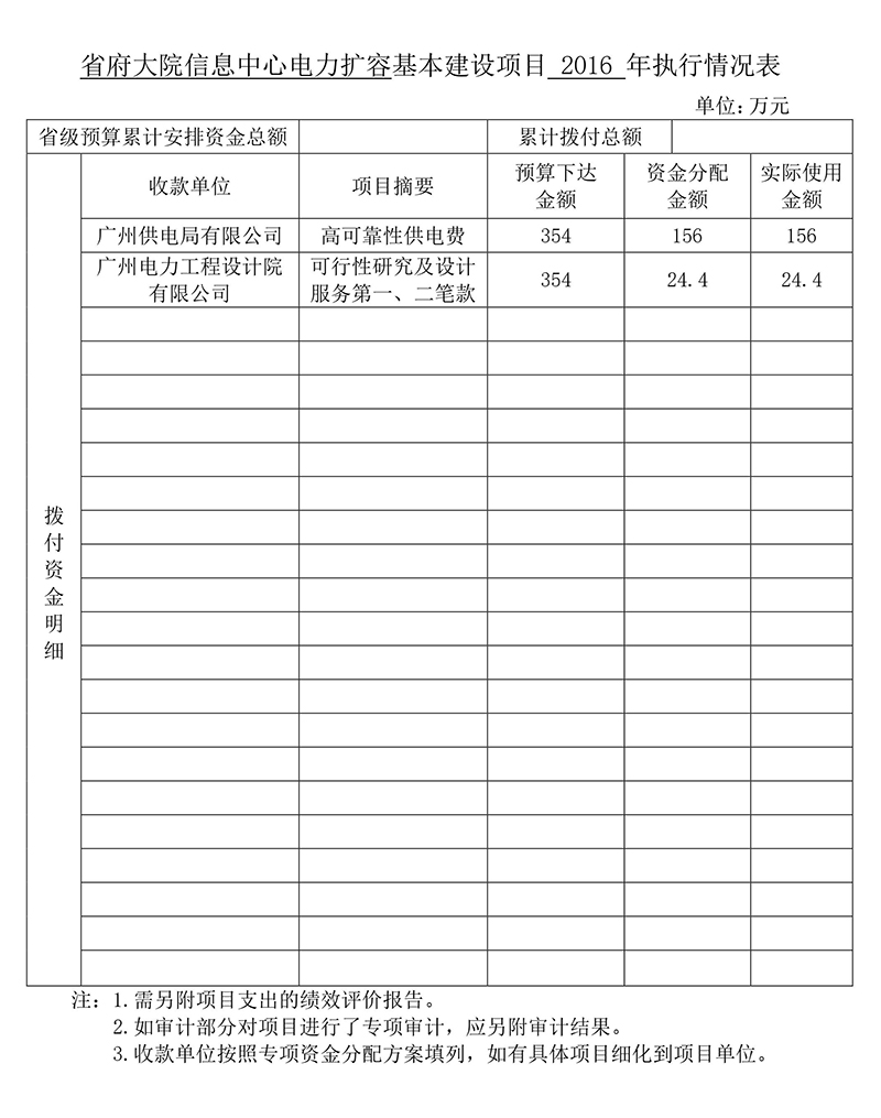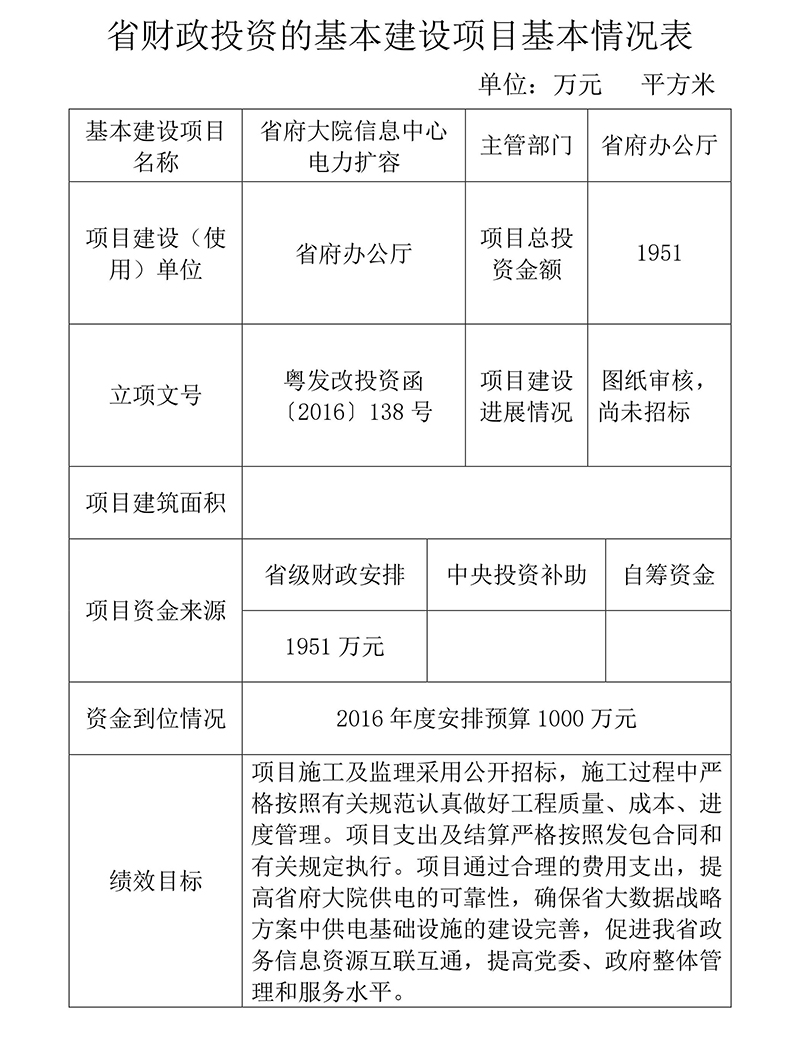 省府大院信息中心電力擴(kuò)容項(xiàng)目由我廳于2015年1月向省發(fā)展改革委申請(qǐng)立項(xiàng)(粵辦函〔2015〕1號(hào)),今年1月省發(fā)展改革委粵發(fā)改投資函〔2016〕138號(hào)文批復(fù)我廳同意項(xiàng)目立項(xiàng),今年3月你廳粵財(cái)建〔2016〕27號(hào)文批復(fù)該項(xiàng)目2016年度預(yù)算資金1000萬元。
