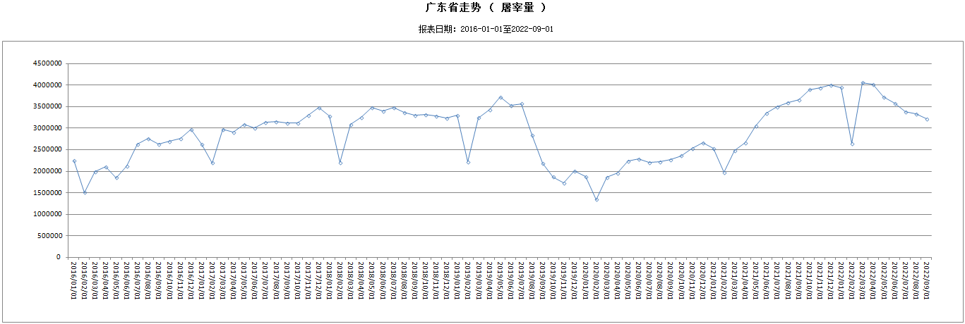 據對全省319家生豬定點屠宰企業(yè)跟蹤監(jiān)測,9月份共屠宰生豬3226459頭,比8月份下降3.03%。