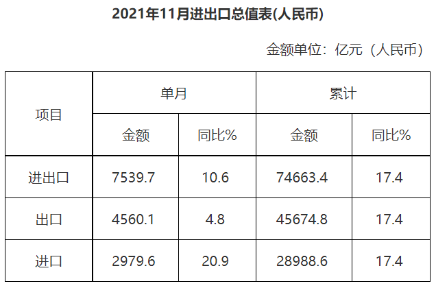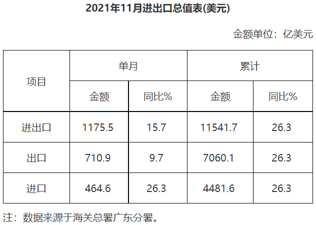 廣東省外貿(mào)進出口總值表(2021年11月)