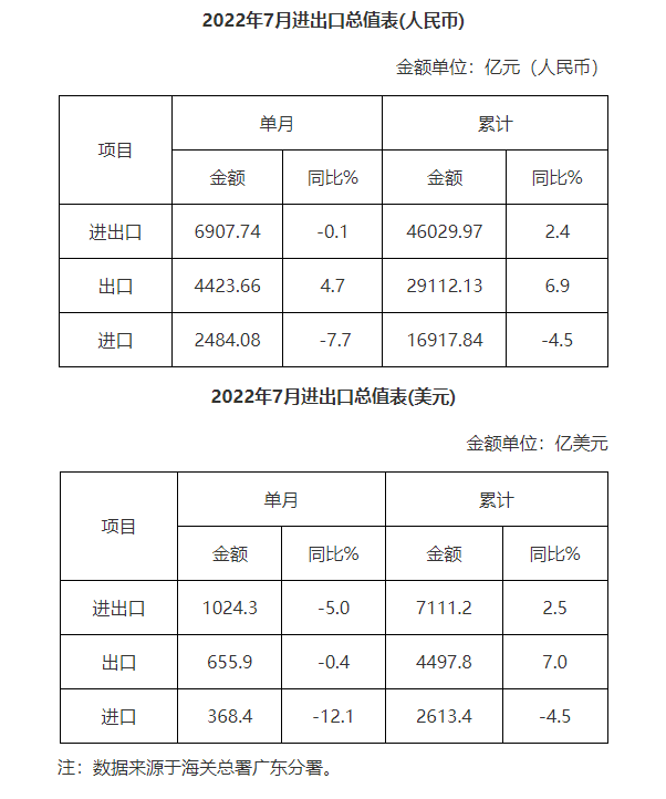 廣東省外貿(mào)進出口總值表(2022年7月)