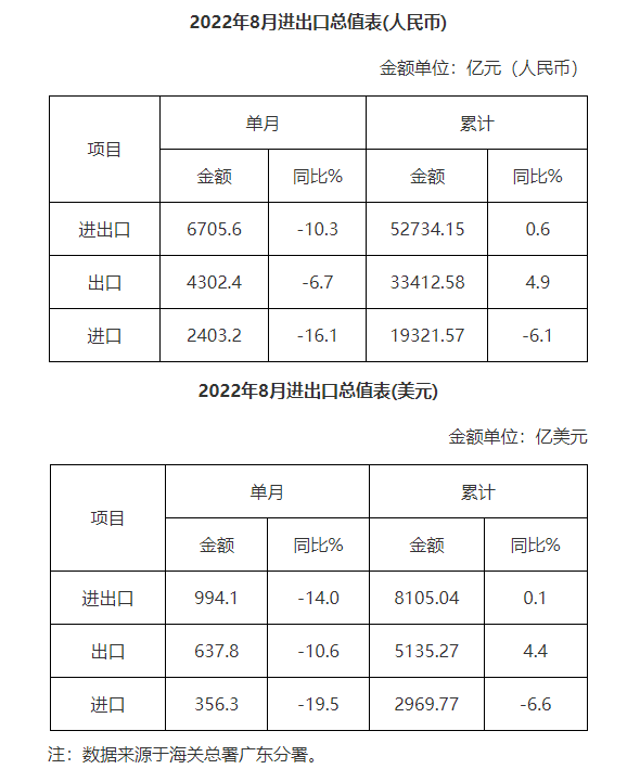 廣東省外貿(mào)進出口總值表(2022年8月)