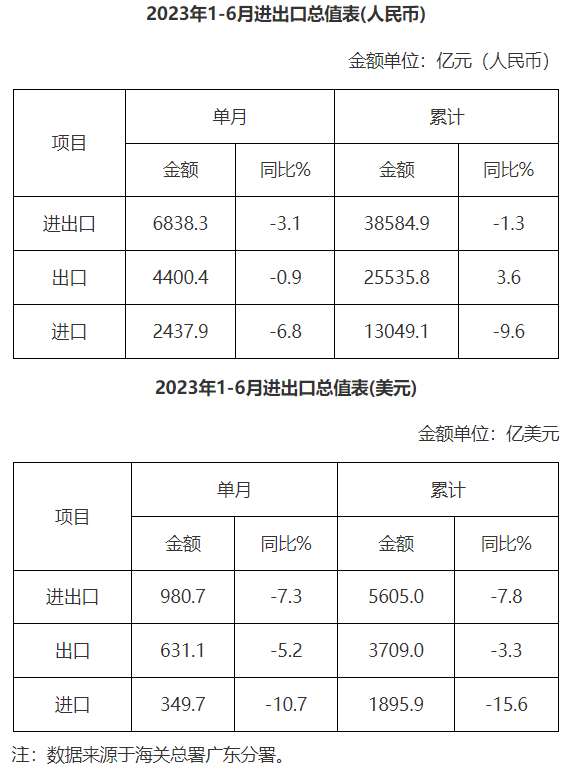 廣東省外貿(mào)進出口總值表(2023年1-6月)