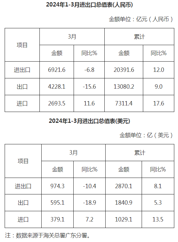 廣東省外貿(mào)進(jìn)出口總值表(2024年1-3月)