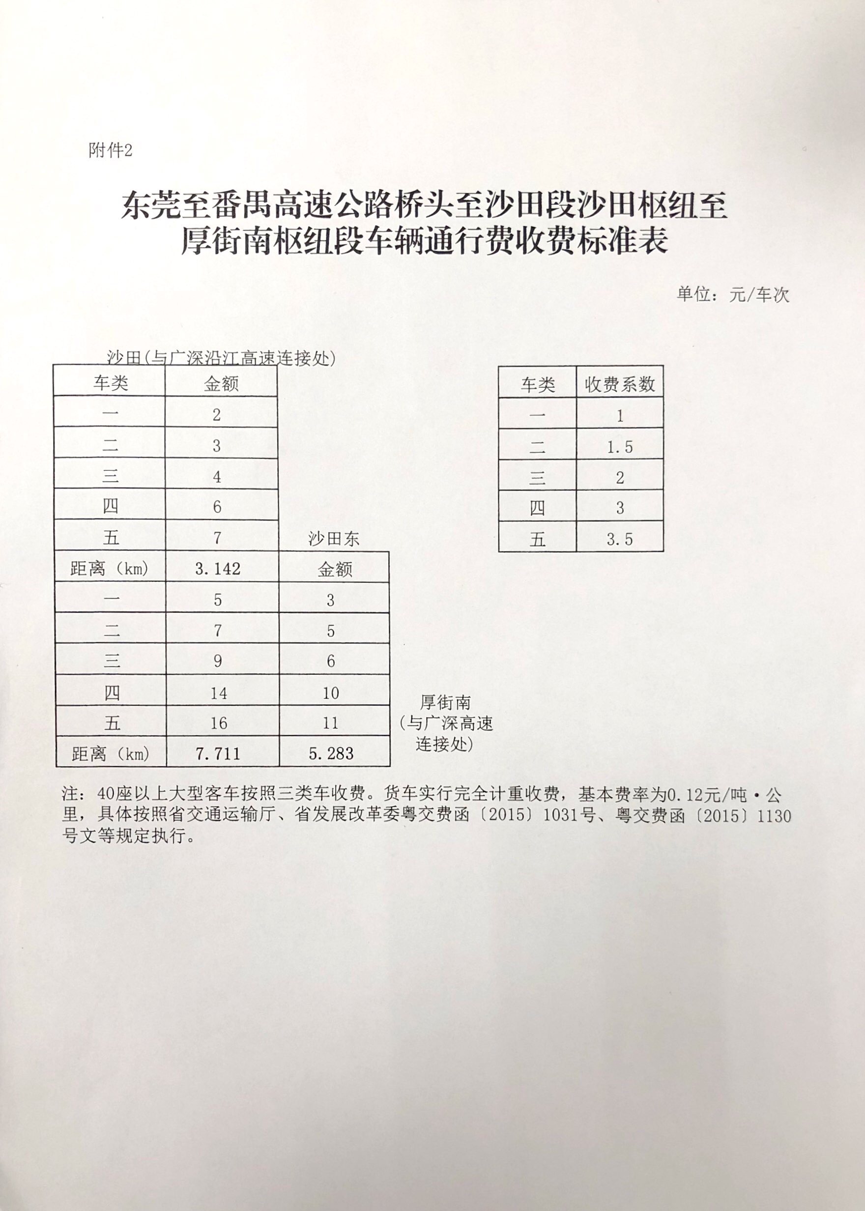 粵交費(fèi)〔2019〕333號(hào)請示收悉。同意東莞至番禺高速公路橋頭至沙田段沙田樞紐至厚街南樞紐段交工驗(yàn)收通車和收費(fèi)站收費(fèi)設(shè)施經(jīng)驗(yàn)收符合省聯(lián)網(wǎng)收費(fèi)技術(shù)要求后開始收費(fèi),收費(fèi)車型按國家統(tǒng)一標(biāo)準(zhǔn)進(jìn)行分類,1至5類車的收費(fèi)系數(shù)分別為1、1.5、2、3、3.5;貨車實(shí)行完全計(jì)重收費(fèi),基本費(fèi)率為0.12元/噸·公里。