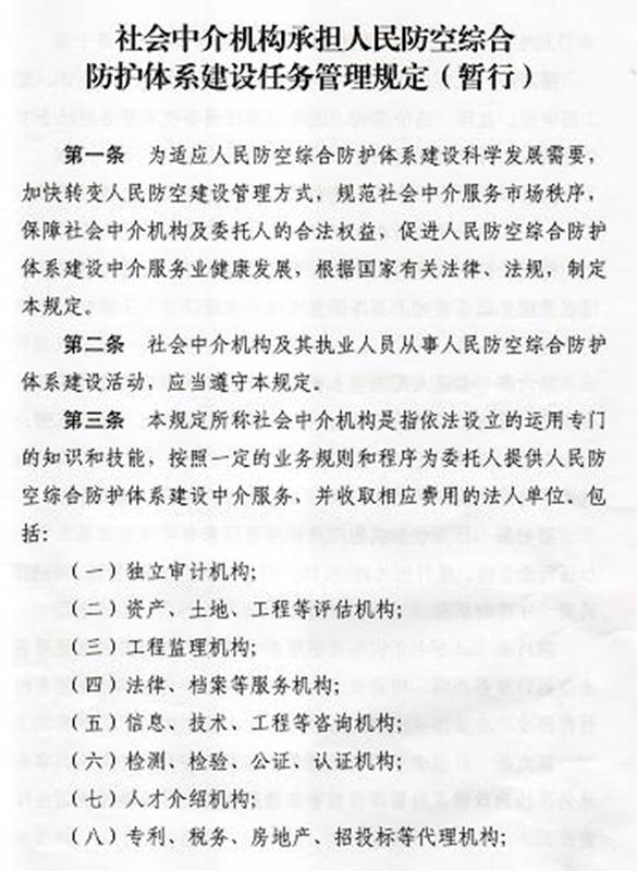 社會中介機構(gòu)承擔人民防空綜合防護體系建設任務管理規(guī)定(暫行)