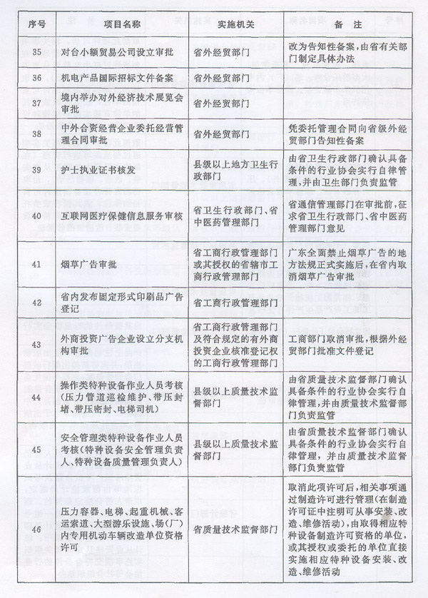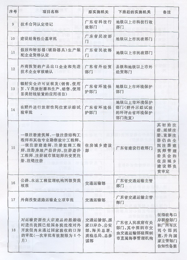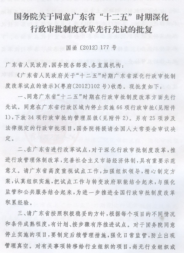 ? 廣東省人民政府轉(zhuǎn)發(fā)《國務(wù)院關(guān)于同意 廣東省“十二五”時期深化行政審批 制度改革先行先試的批復(fù)》的通知 ? 各地級以上市人民政府,各縣(市、區(qū))人民政府,省政府各部門、各直屬機構(gòu): 現(xiàn)將《國務(wù)院關(guān)于同意廣東省“十二五”時期深化行政審批制度改革先行先試的批復(fù)》(國函〔2012〕177號)轉(zhuǎn)給你們,并結(jié)合我省實際提出以下意見,請一并認(rèn)真貫徹執(zhí)行。 一、積極穩(wěn)妥做好實施工作 各地、各部門要結(jié)合當(dāng)前正在推進(jìn)的各級行政審批制度改革工作,抓緊制訂具體實施方案,明確實施時間、任務(wù)和進(jìn)度安排等,確保行政審批項目取消和調(diào)整工作及時落實到位。 ?。ㄒ唬╆P(guān)于國務(wù)院同意在我省行政區(qū)域內(nèi)停止實施的行政審批事項。 對國務(wù)院同意在我省行政區(qū)域內(nèi)停止實施的行政審批事項,原實施機關(guān)自本通知下發(fā)之日起停止實施,不得變相審批。 對國務(wù)院同意在我省行政區(qū)域內(nèi)政府部門不再實施、轉(zhuǎn)移給具備條件的行業(yè)組織實行自律管理的事項,要根據(jù)國函〔2012〕177號文規(guī)定的具體內(nèi)容,結(jié)合省編委《政府向社會轉(zhuǎn)移職能工作方案》(粵機編〔2012〕22號)有關(guān)要求,分類分步轉(zhuǎn)移,積極穩(wěn)妥有序推進(jìn),確保相關(guān)事項“轉(zhuǎn)得出、接得穩(wěn)”。已經(jīng)具備條件的事項,要立即實施轉(zhuǎn)移;基本具備條件的事項,要制訂分步驟分階段工作安排,逐步實施轉(zhuǎn)移;暫不具備條件的事項,要加快培育行業(yè)組織,設(shè)定一定過渡期并明確過渡期內(nèi)的管理安排。各部門要就每項轉(zhuǎn)移事項制訂實施方案,報本級機構(gòu)編制部門或行政審批制度改革牽頭部門審定。除需新成立行業(yè)組織后再實施轉(zhuǎn)移的事項外,其他轉(zhuǎn)移事項的交接工作爭取在2013年上半年基本完成。 ?。ǘ╆P(guān)于國務(wù)院同意下放管理層級的行政審批事項。 由國家部門下放到我省實施的行政審批事項,各地、各部門要積極主動與國家有關(guān)部門做好溝通銜接,爭取在2012年年底前完成交接工作,并在國家相關(guān)部門的指導(dǎo)下,依法開展行政審批。 對國務(wù)院同意我省下放到市、縣實施的行政審批事項,原實施機關(guān)要在2012年年底前與承接單位完成交接工作,并通過有效方式向社會公布交接日期、下放事項及權(quán)責(zé)關(guān)系等。在交接期間,原實施機關(guān)要繼續(xù)做好相關(guān)管理工作,防止交接過程中出現(xiàn)管理“真空”。原實施機關(guān)要加強對承接單位的業(yè)務(wù)培訓(xùn)和指導(dǎo),促進(jìn)承接單位依法依規(guī)有序開展工作。行政審批事項下放后,實施機關(guān)為市、縣(市、區(qū))人民政府的,由市、縣(市、區(qū))人民政府確定具體實施部門。除另有規(guī)定外,佛山市順德區(qū)政府(部門)享有下放給地級以上市政府(部門)的權(quán)限。 二、切實加強監(jiān)管 在取消、調(diào)整行政審批事項的同時,要努力改變重審批、輕監(jiān)管的管理方式,加快推動政府部門工作重心向制訂標(biāo)準(zhǔn)規(guī)則和強化監(jiān)管轉(zhuǎn)移,管理方式由事前審批向事中、事后監(jiān)管轉(zhuǎn)變。各部門要根據(jù)省編委《關(guān)于加強對行政審批制度改革調(diào)整事項監(jiān)管的意見》(粵機編〔2012〕23號)有關(guān)要求,結(jié)合社會信用體系建設(shè)和市場監(jiān)管體系建設(shè),針對取消、調(diào)整的行政審批事項,逐項制訂具體監(jiān)管辦法,切實履行好后續(xù)監(jiān)管職責(zé),抓緊完善各領(lǐng)域、各環(huán)節(jié)的監(jiān)管制度和管理規(guī)范,強化監(jiān)管責(zé)任,落實監(jiān)管措施,防止監(jiān)管缺位。 三、加快培育發(fā)展和規(guī)范社會組織 按照省委、省政府《關(guān)于進(jìn)一步培育發(fā)展和規(guī)范管理社會組織的方案》(粵發(fā)〔2012〕7號)有關(guān)要求,積極推進(jìn)社會組織去行政化和去壟斷化,加大對社會組織發(fā)展扶持力度,擴大政府購買服務(wù),鼓勵和引導(dǎo)社會組織更多地參與社會服務(wù)和社會管理事務(wù),促進(jìn)社會組織良性有序發(fā)展。加快構(gòu)建社會組織綜合監(jiān)管體系,建立健全社會組織服務(wù)管理能力評估辦法,引導(dǎo)社會組織建立健全規(guī)范運作、誠信執(zhí)業(yè)、信息公開、公平競爭、獎勵懲戒、自律保障等機制。 四、推進(jìn)行政審批標(biāo)準(zhǔn)化規(guī)范化建設(shè) 加快出臺《廣東省行政審批事項目錄管理辦法》,對行政審批事項實行目錄管理,建立行政審批事項動態(tài)清理調(diào)整機制。創(chuàng)新審批方式,建立和完善審批標(biāo)準(zhǔn),優(yōu)化審批流程,簡化審批程序,嚴(yán)格規(guī)范行政審批自由裁量權(quán)。加快網(wǎng)上辦事大廳建設(shè),推進(jìn)網(wǎng)上審批、并聯(lián)審批和服務(wù)質(zhì)量公開承諾,進(jìn)一步健全行政審批服務(wù)體系,不斷提高行政審批服務(wù)水平。 五、加強組織領(lǐng)導(dǎo) 國務(wù)院批準(zhǔn)我省“十二五”時期深化行政審批制度改革先行先試,對我省加快轉(zhuǎn)變政府職能,率先探索構(gòu)建具有強大動力、充滿活力和可持續(x