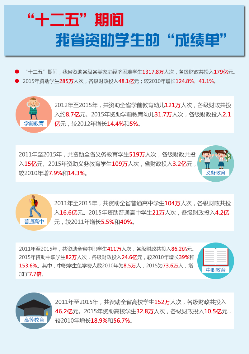 省教育廳有關(guān)負(fù)責(zé)人介紹,“十二五”時期,我省學(xué)生資助工作推進(jìn)力度最大,取得長足發(fā)展,各級各類教育資助資金總投入達(dá)179億元(不含深圳),受助學(xué)生達(dá)1317.8萬人,有效解決了困難家庭子女上學(xué)難的問題。接下來,將以精準(zhǔn)助學(xué)為主線,以立德樹人為統(tǒng)領(lǐng),不斷提高學(xué)生資助水平,助力全面建成小康社會。