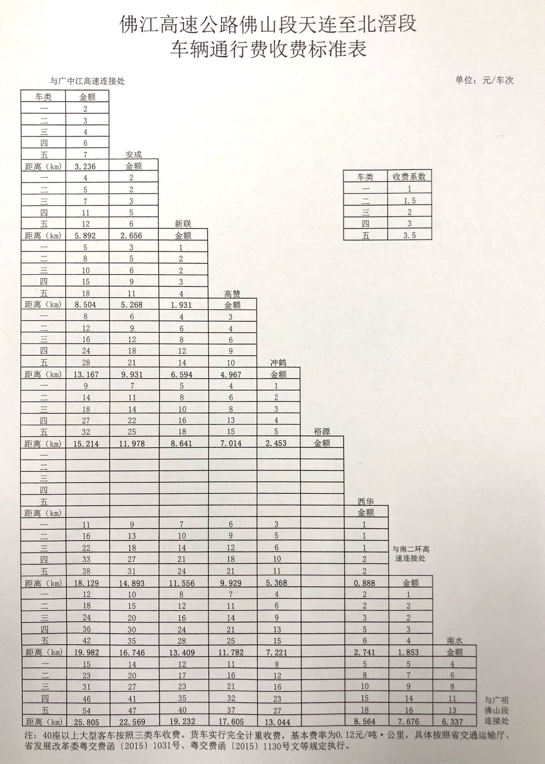 粵交費〔2019〕43號請示收悉。同意佛江高速公路佛山段天連至北滘段交工驗收通車和收費站收費設施經(jīng)驗收符合省聯(lián)網(wǎng)收費技術要求后開始收費,收費車型按國家統(tǒng)一標準進行分類,1至5類車的收費系數(shù)分別為1、1.5、2、3、3.5,收費費率為0.60元/標準車公里;貨車實行完全計重收費,基本費率為0.12元/噸·公里。