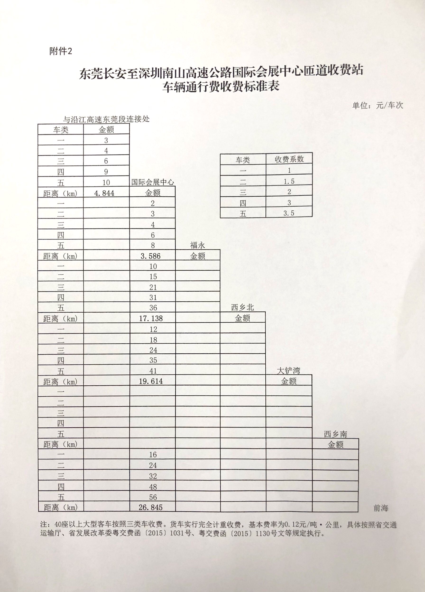 2.?東莞長安至深圳南山高速公路國際會展中心收費(fèi)站車輛通行費(fèi)收費(fèi)標(biāo)準(zhǔn)表