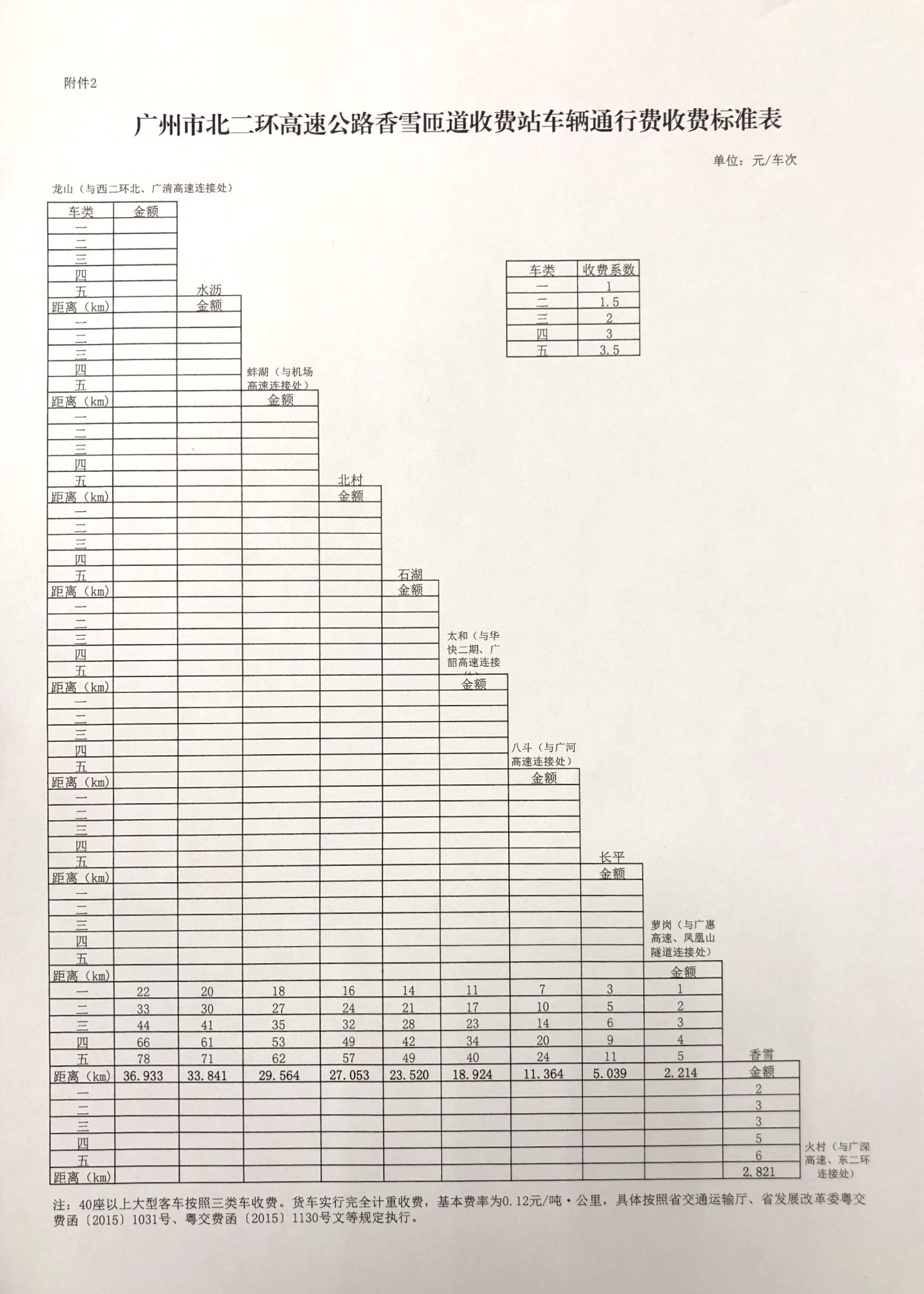 2.?廣州市北二環(huán)高速公路香雪匝道收費(fèi)站車輛通行費(fèi)收費(fèi)標(biāo)準(zhǔn)表