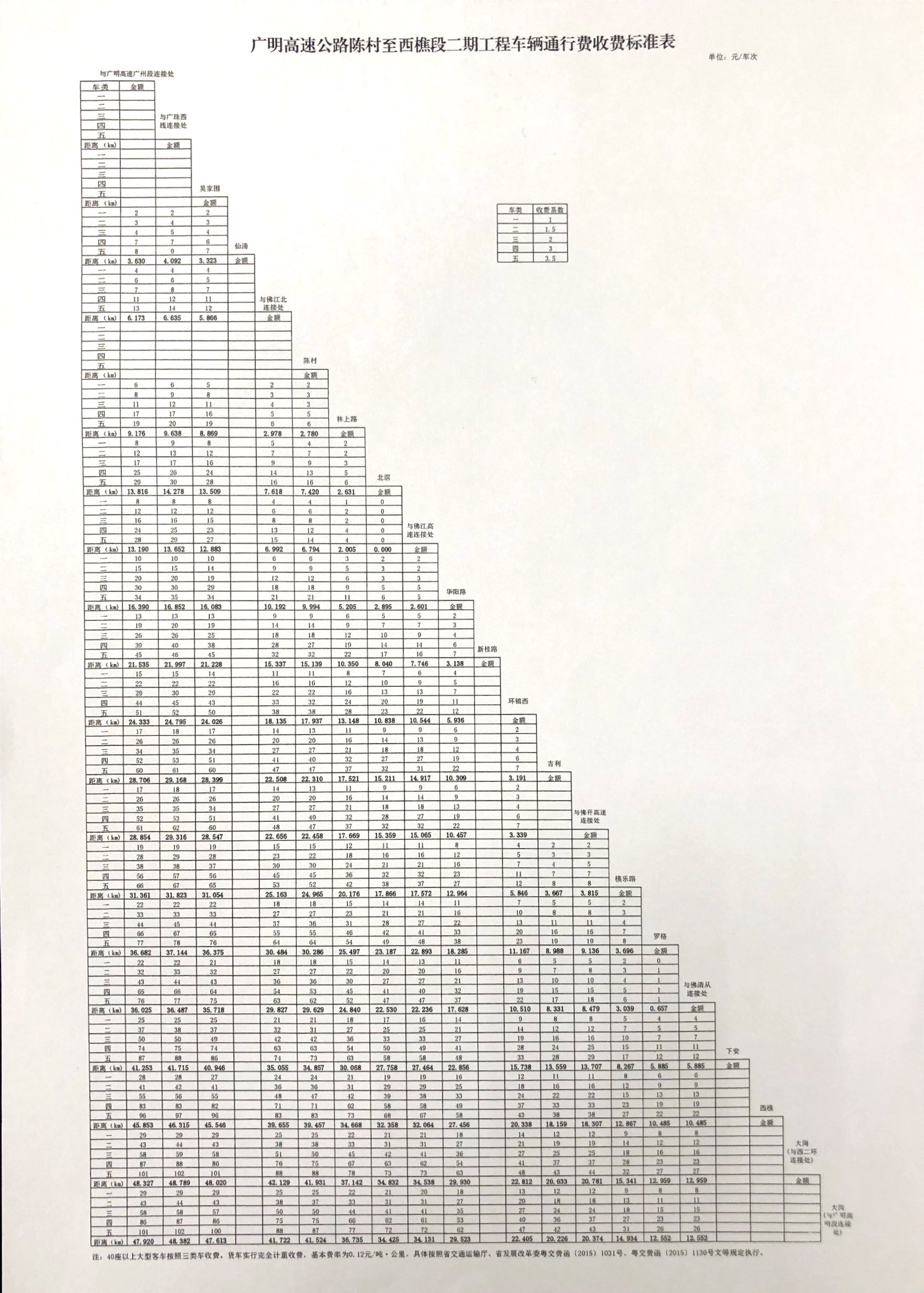 粵交費〔2019〕363號請示收悉。同意廣明高速公路陳村至西樵段二期工程交工驗收通車和收費站收費設(shè)施經(jīng)驗收符合省聯(lián)網(wǎng)收費技術(shù)要求后開始收費,收費車型按國家統(tǒng)一標準進行分類,1至5類車的收費系數(shù)分別為1、1.5、2、3、3.5;貨車實行完全計重收費,基本費率為0.12元/噸·公里。