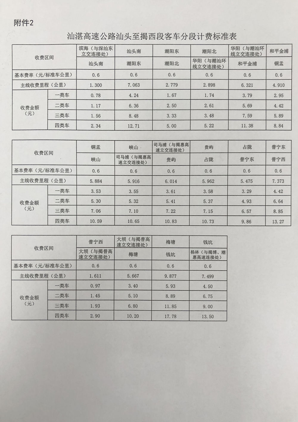 2.汕湛高速公路汕頭至揭西段客車分段計(jì)費(fèi)標(biāo)準(zhǔn)表